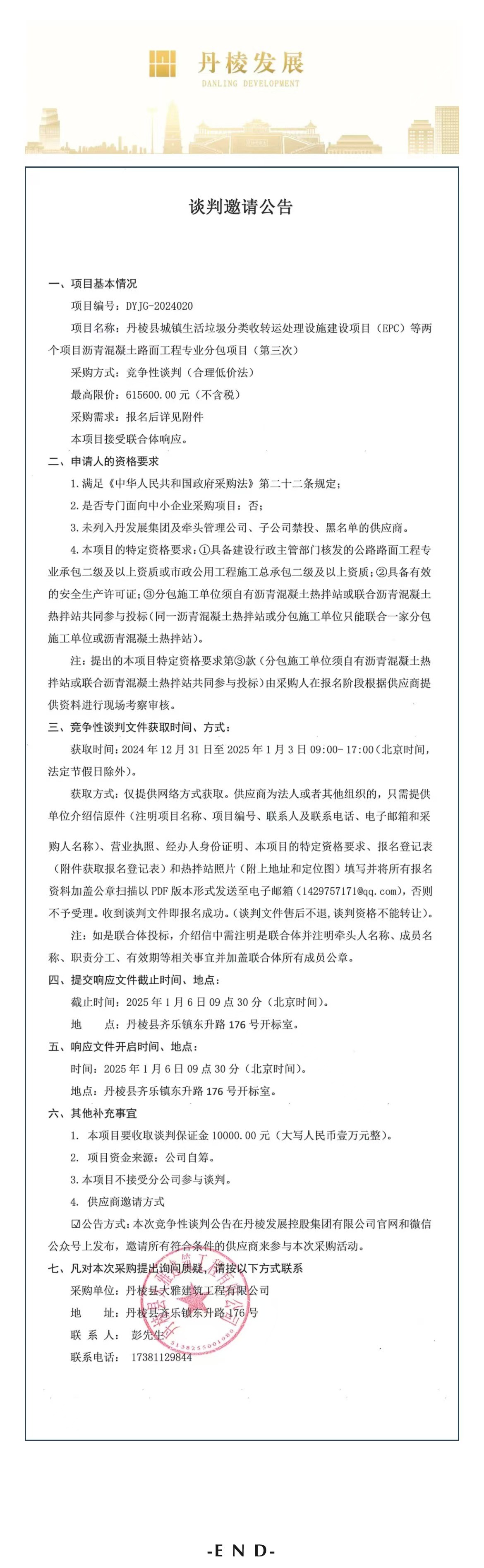 丹棱縣城鎮(zhèn)生活垃圾分類收轉(zhuǎn)運(yùn)處理設(shè)施建設(shè)項(xiàng)目(EPC)等兩個(gè)項(xiàng)目瀝青混凝土路面工程專業(yè)分包項(xiàng)目(第三次)談判邀請(qǐng)公告