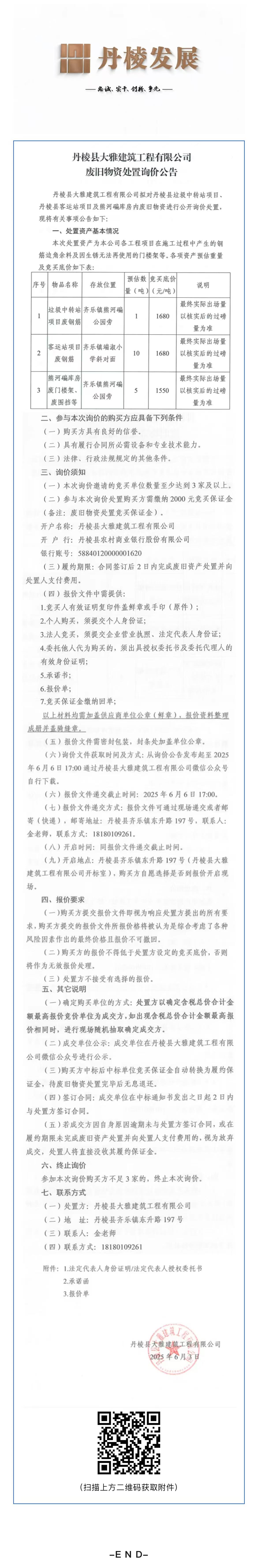 丹棱縣大雅建筑工程有限公司廢舊物資處置詢價(jià)公告