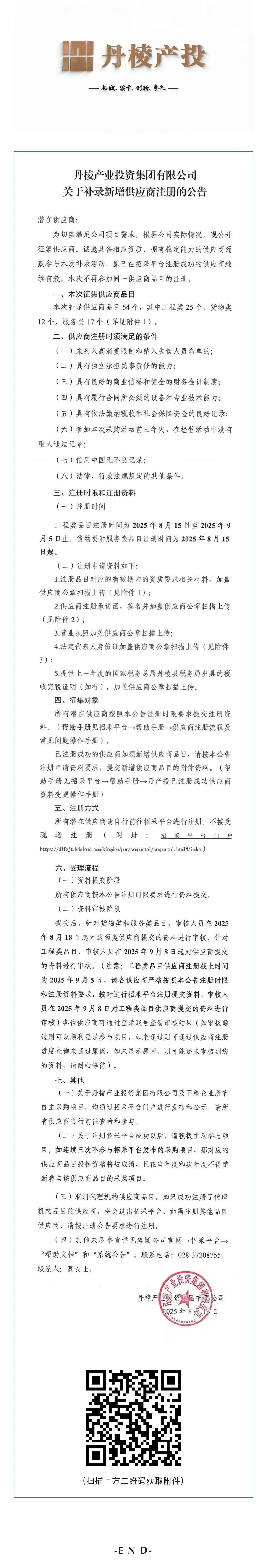 丹棱產(chǎn)業(yè)投資集團(tuán)有限公司關(guān)于補(bǔ)錄新增供應(yīng)商注冊的公告