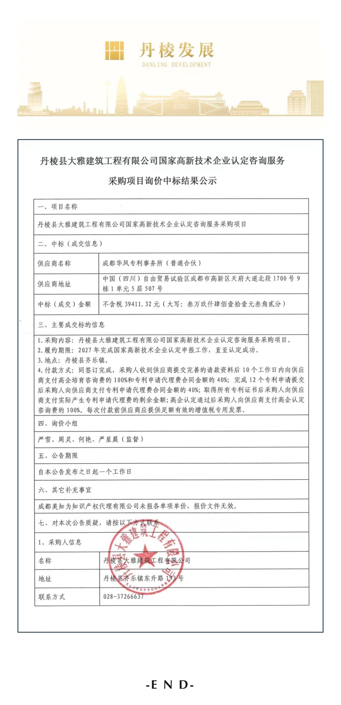 丹棱縣大雅建筑工程有限公司國家高新技術(shù)企業(yè)認定咨詢服務采購項目詢價中標結(jié)果公示
