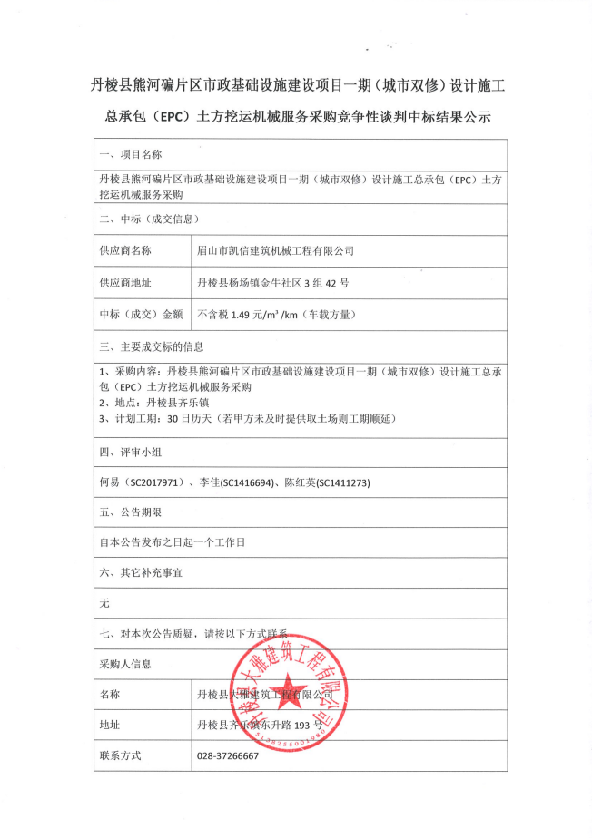 丹棱縣熊河碥片區(qū)市政基礎設施建設項目一期(城市雙修)設計施工 總承包(EPC)土方挖運機械服務采購競爭性談判中標結(jié)果公示