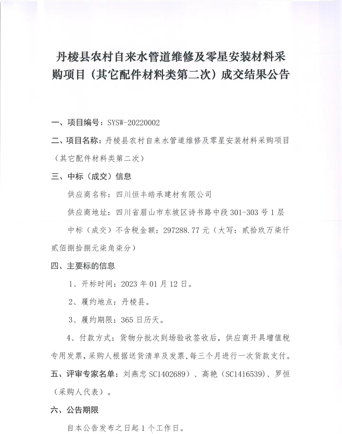 丹棱縣農(nóng)村自來水管道維修及零星安裝材料采購(gòu)項(xiàng)目(其它配件材料類第二次) 成交結(jié)果公告