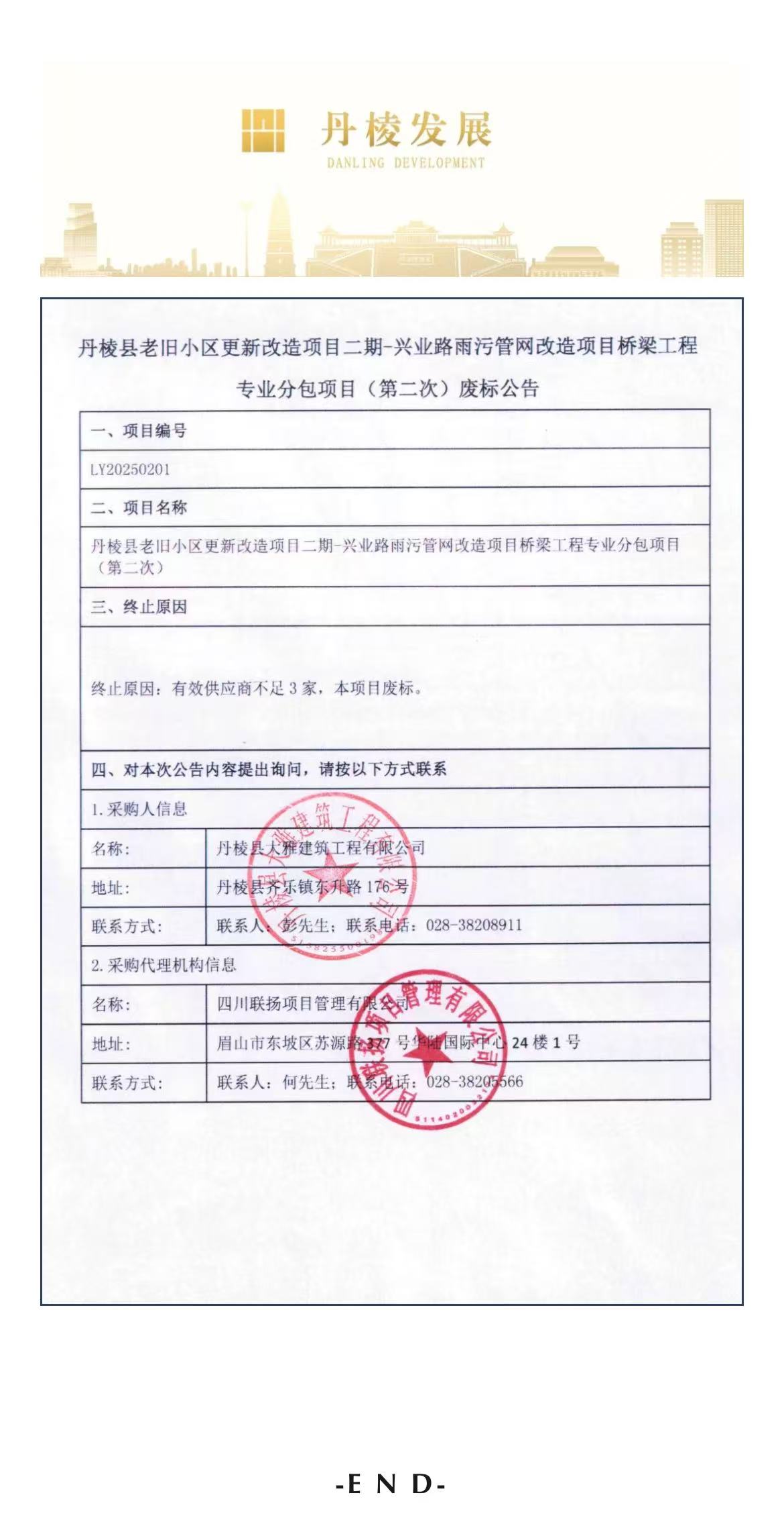 丹棱縣老舊小區(qū)更新改造項(xiàng)目二期-興業(yè)路雨污管網(wǎng)改造項(xiàng)目橋梁工程專(zhuān)業(yè)分包項(xiàng)目(第二次)廢標(biāo)公告