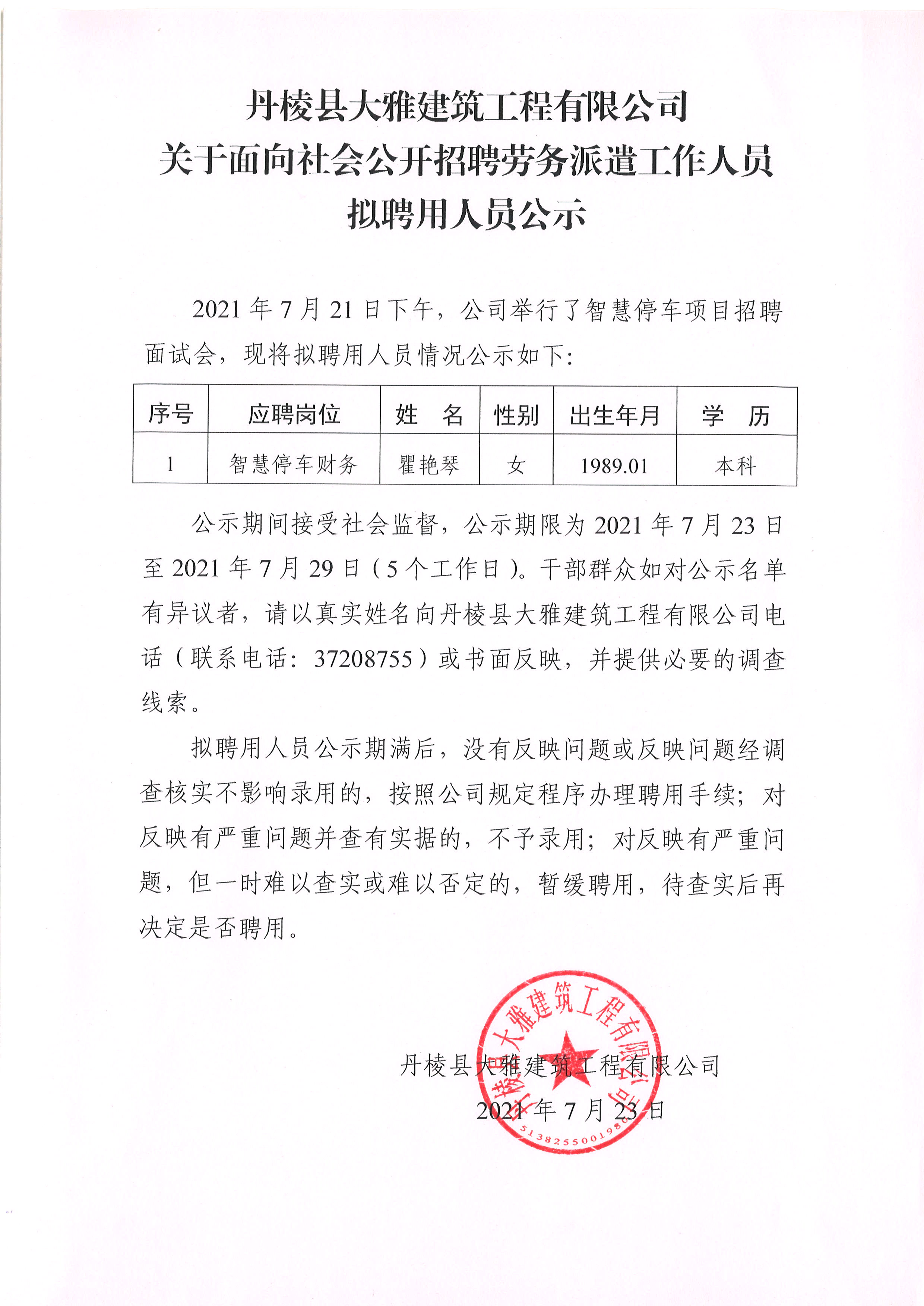 【大雅建筑公司】關(guān)于面向社會公開招聘勞務派遣工作人員擬聘用人員公示