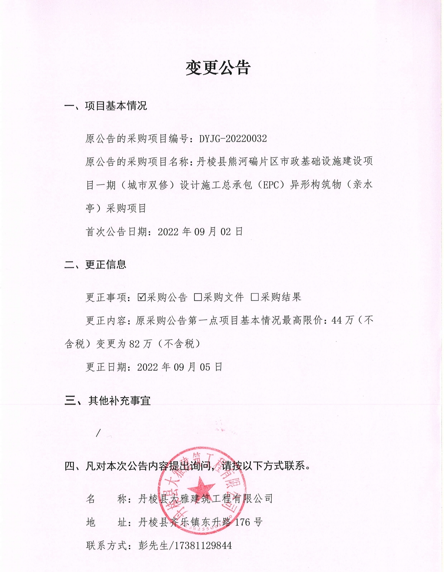丹棱縣熊河碥片區(qū)市政基礎設施建設項目一期(城市雙修)設計施工總承包(EPC)異形構筑物(親水亭)采購項目變更公告