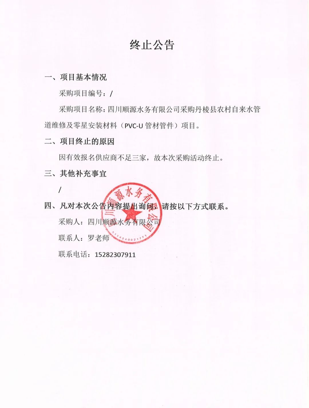 四川順源水務有限公司采購丹棱縣農村自來水管道維修及零星安裝材料(PVC-U管材管件)項目終止公告