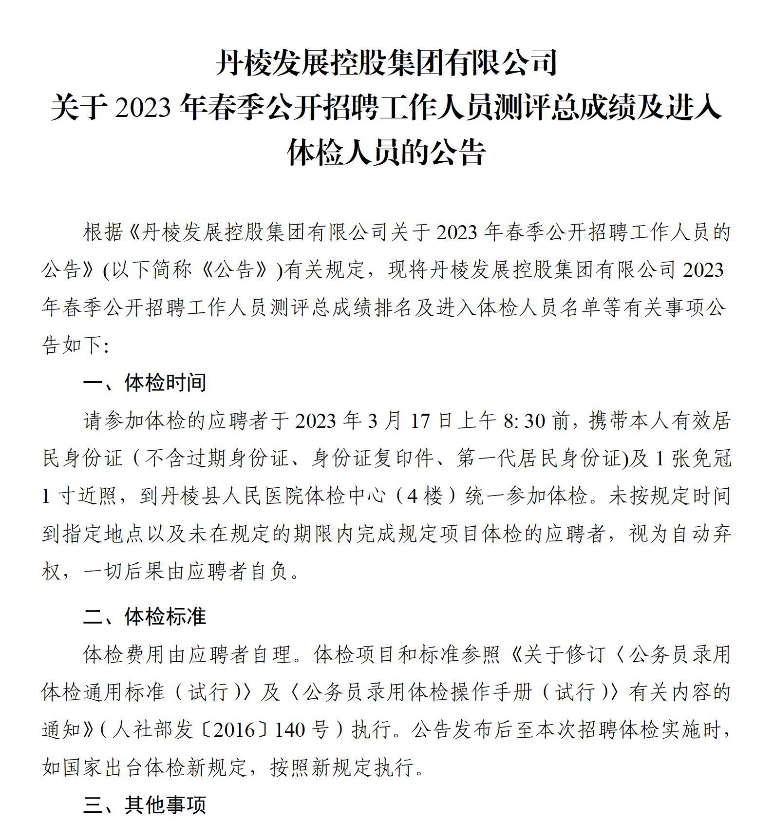 丹棱發(fā)展控股集團(tuán)有限公司關(guān)于2023年春季公開(kāi)招聘工作人員測(cè)評(píng)總成績(jī)及進(jìn)入體檢人員的公告