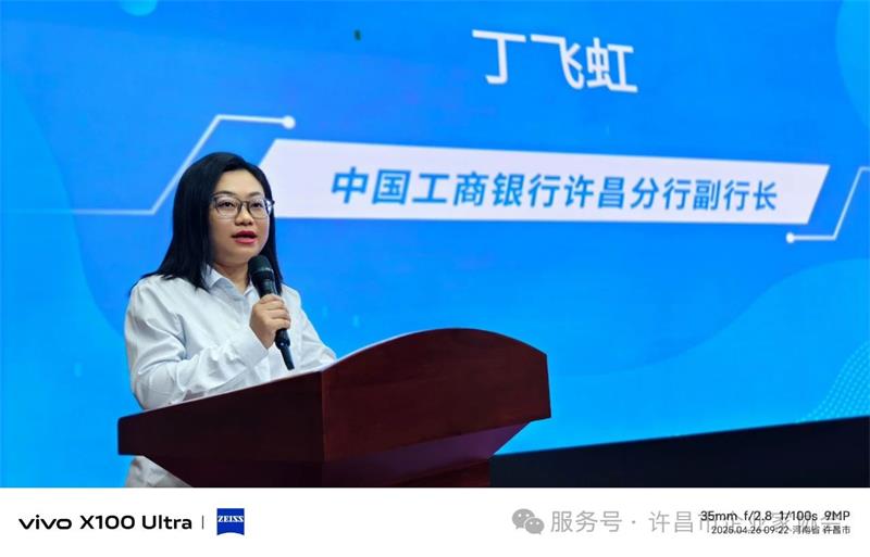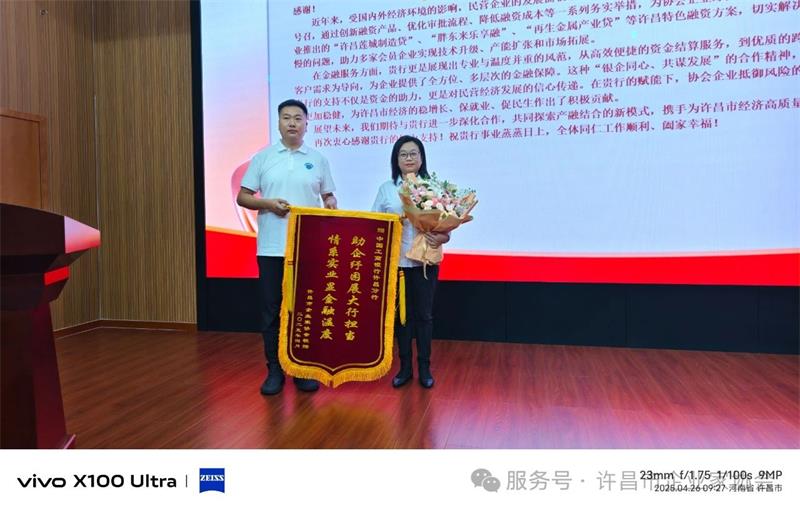 隨后,中國工商銀行許昌分行副行長丁飛虹登臺致辭。丁飛虹表示:"工商銀行始終與企業(yè)家同心同行,將持續(xù)為許昌企業(yè)發(fā)展提供優(yōu)質(zhì)金融服務(wù)。"為表達(dá)對工商銀行長期支持的誠摯謝意,副秘書長張磊代表協(xié)會向工商銀行贈送了繡有"助企紓困展大行擔(dān)當(dāng) 情系實(shí)業(yè)顯金融溫度"字樣的錦旗和感謝信,現(xiàn)場響起熱烈掌聲。