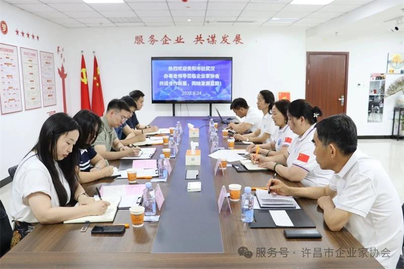 2025年6月24日上午,貴陽(yáng)市人民政府駐武漢辦事處副主任姚固濤一行5人到訪我會(huì)進(jìn)行工作交流。協(xié)會(huì)秘書(shū)長(zhǎng)黃玉霞、常務(wù)副秘書(shū)長(zhǎng)范文彥、本月份值班會(huì)長(zhǎng)李偉平、四月份值班會(huì)長(zhǎng)韋永才、七月份值班會(huì)長(zhǎng)張?zhí)┟窆餐哟⑴e行座談。